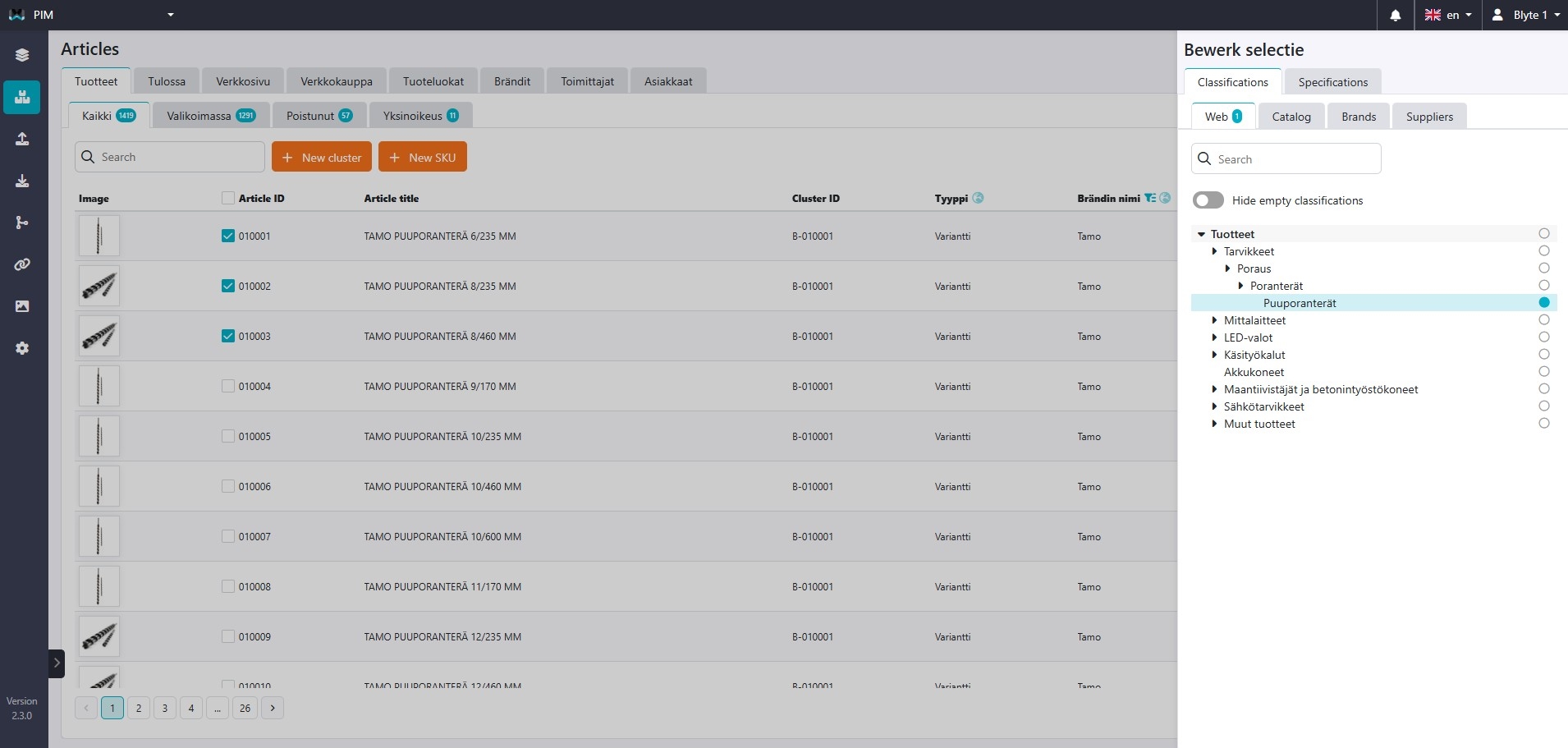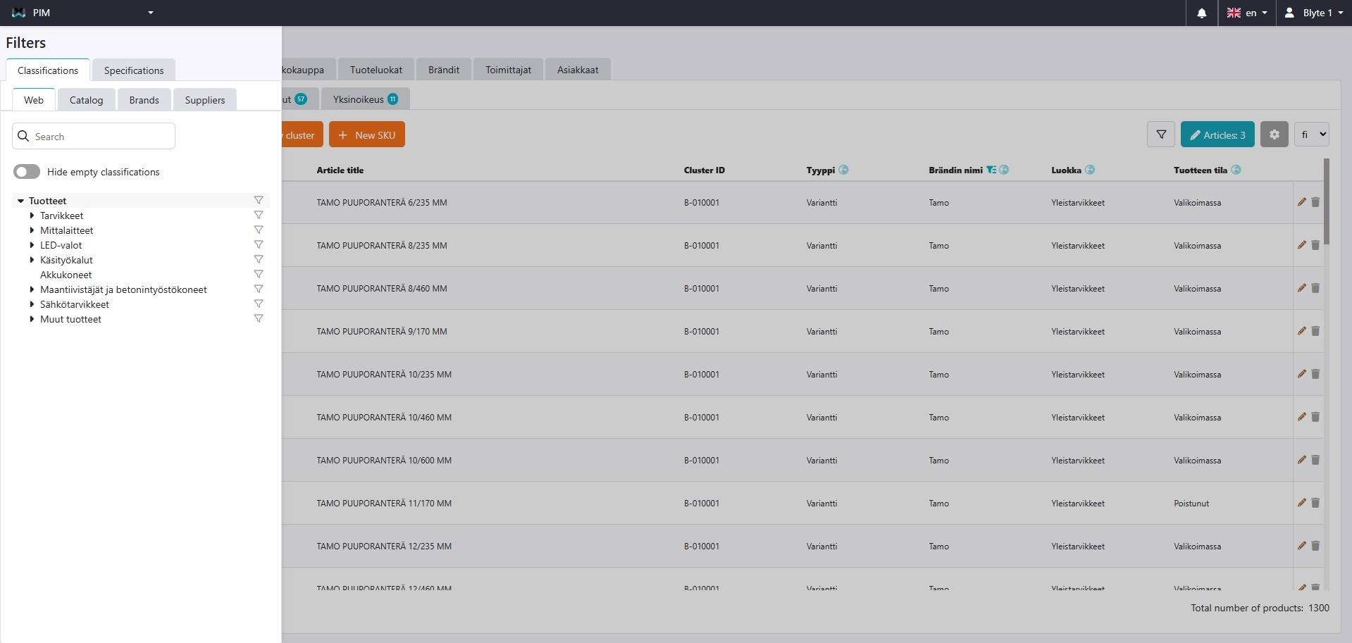 In addition to the familiar functions such as search, new SKU creation, and cluster management, the article overview in Pimmix has been further improved. Users can now display more columns, sort data more easily, and work with a faster and more responsive interface.