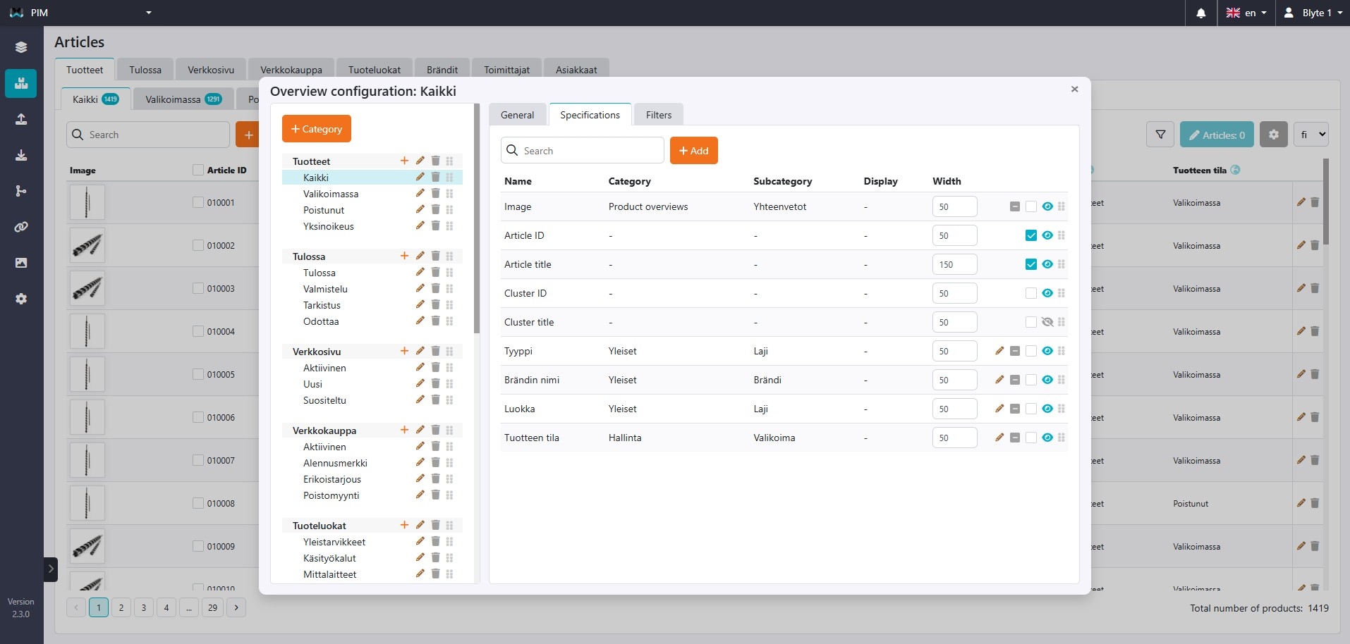 Pimmix version 2.3 introduces a set of foundational improvements that enhance how users view, search, and manage product data across the system. The update focuses on making large datasets easier to work with by improving configurability, visibility, and day-to-day usability. More flexible views, improved sorting and filtering, and clearer data presentation help users navigate complex assortments faster and with fewer errors.