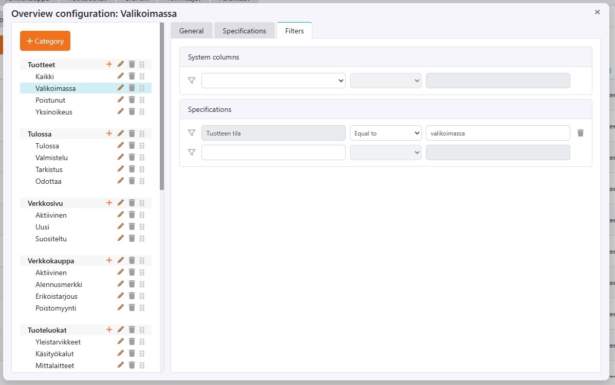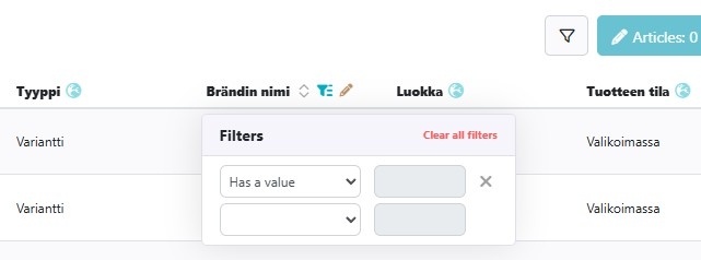 You can define standard filters for any specification directly from the filter menu. For example, you can filter articles with incomplete assets or items that are available at a specific retailer.